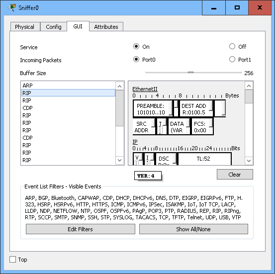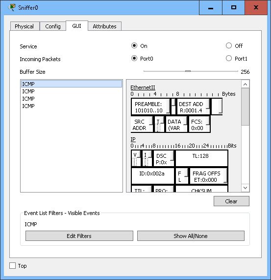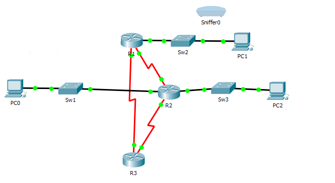 Disconnect your wire from the switch by clicking on the green circle on the switch side. Drag the connection over and connect it to Ethernet 0 on the sniffer.