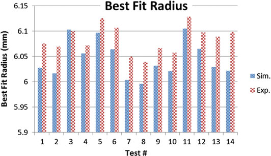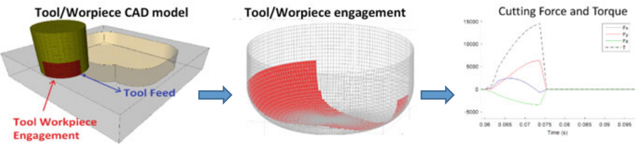 One challenge for this simulation is that the original stock geometry is not known with certainty, where the stock ID from the forge set at 253±1 mm is provided. Furthermore, the large size of the tool relative to the part geometry created issues for determining tool workpiece engagement with precision. To account for these issues, the part STL geometry is created with a tapered inner surface, which starts with an ID of 254 mm at the start of the cut, and 242 mm at the end of the cut. Additionally, the tool mesh and the engagement precision are set very fine to capture changes to the TWE due to small changes in the part ID.