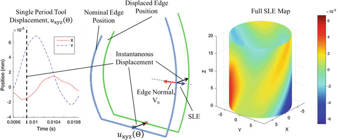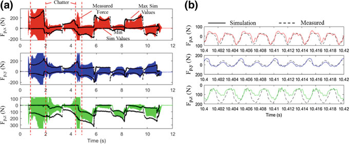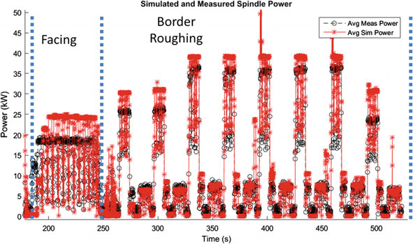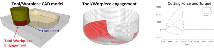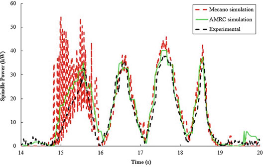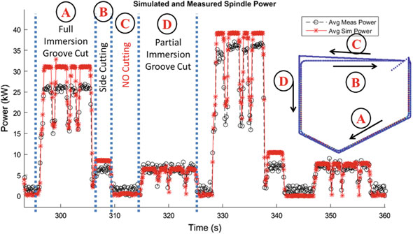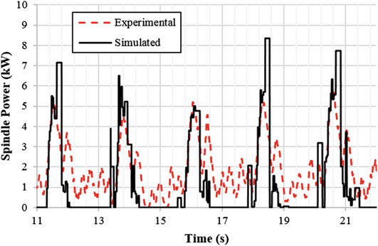 Accurate torque predictions from the updated process model give process plan-ners the opportunity to look for issues with a machining operation before a part is produced. Figure 16.8b shows an example of how this can be used to prevent torque overload. The spindle used here has a torque limit of 27 Nm at 5000 RPM. It can be seen from these results that the torque limit is surpassed close to the beginning of the cut. It is known from the machine measurement that the tool feed slows during the operation, and it is also possible the torque overload caused a decrease in the spindle RPM as well. The overall result is an operation which takes longer to complete than planned and which pushes the spindle to its performance limits.