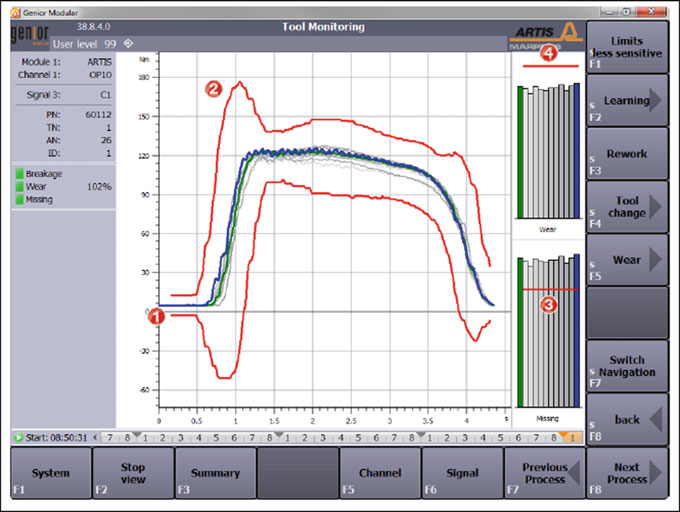 Figure 16.24 shows an example of the tool wear estimation for tool 5208 based on spindle torque measurement. The accelerated tool wear zone can be clearly identified in both operations made with this tool for each workpiece. Accelerated wear zone is detected around 130 parts before is changed. As shown in Fig. 16.25, tool is replaced by RENAULT based on “frequency”, i.e. maximum parts produced counter is reached, and not for accelerated wear. Machining with tools in the accelerated wear zone increases risks of both tool breakage and quality problems on the workpiece.