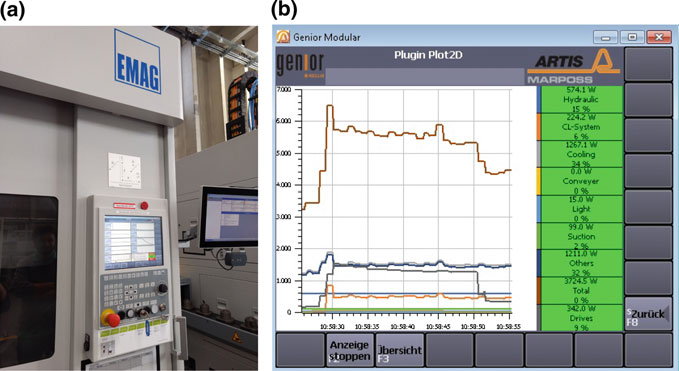 Whenimplementingademand-orientedcontroloftheauxiliaryunits,thetechnical restrictions and start-up times must be respected. The proposed operation modes consider the existent restrictions and switch off the modules only when it is safe for the components and the machine. In production mode, after 1 min of inactivity, the drives, the hydraulic system pump and the HP-coolant pump are switched off to operational mode. The breaks of the drives are of course activated during this time. After 10 min of inactivity, the machine is switched to stand-by mode, which means