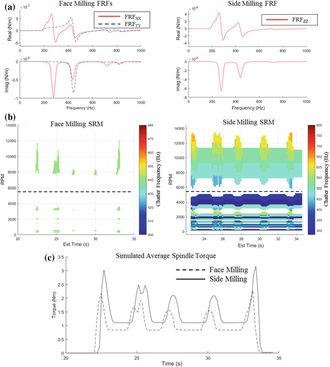 From the simulation results in Fig. 16.11, the facing operation is better suited to this application. While it is predicted that no chatter will occur at 5500 RPM for the side milling case, the conditions are close to the stability boundaries, and there is still a potential of chatter. The facing operation shows a larger separation between the stability boundaries, especially at 5500 RPM. Furthermore, the predicted spindle torque load is approximately 20% lower throughout the facing operation. As a result, face milling at 5500 RPM is recommended for this application with the current tool and part material. Note that these results and recommendations serve as a starting point for the process design based on the available information. At a later stage in development, the simulations should be updated with new data, such as actual part FRF measurements, to further improve the process design.