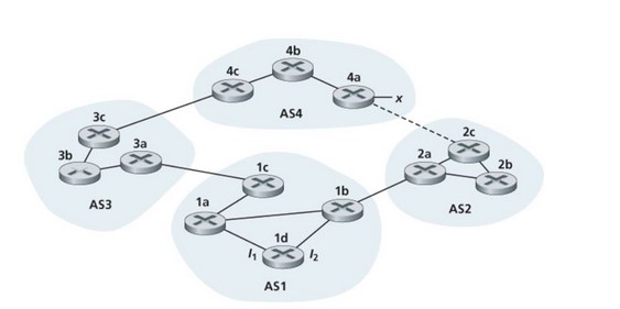 18) Consider the network shown below. Suppose AS3 and AS2 are running OSPF for their intra-AS routing protocol. Suppose AS1 and AS4 are running RIP for their intra-AS routing protocol. Suppose eBGP and iBGP are used for the inter-AS routing protocol. Initially suppose there is no physical link between AS2 and AS4.